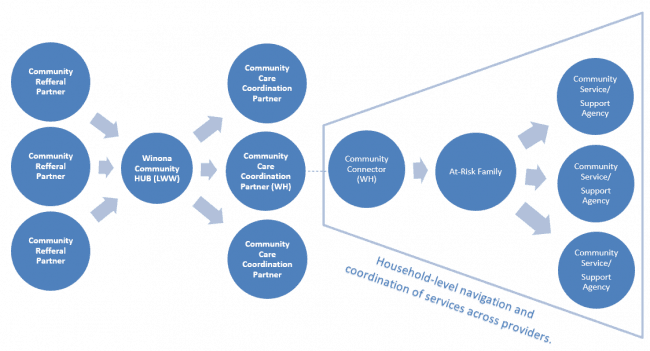 The HUB is an evidence-based model of community care coordination that focuses on addressing social determinant of health (SDOH) risk factors in food insecure or other high-risk individuals. The Winona Community HUB provides the structure to ensure that Winona’s most vulnerable families’ complex needs are addressed in an equitable, unduplicated and meaningful way. The target population for referrals are households must include minors that are 17 years old and under, are Minnesota residents and reside within 25 miles of the city of Winona. In addition, requirements include being screened as food insecure and are either uninsured/private pay, or Minnesota Medicaid.